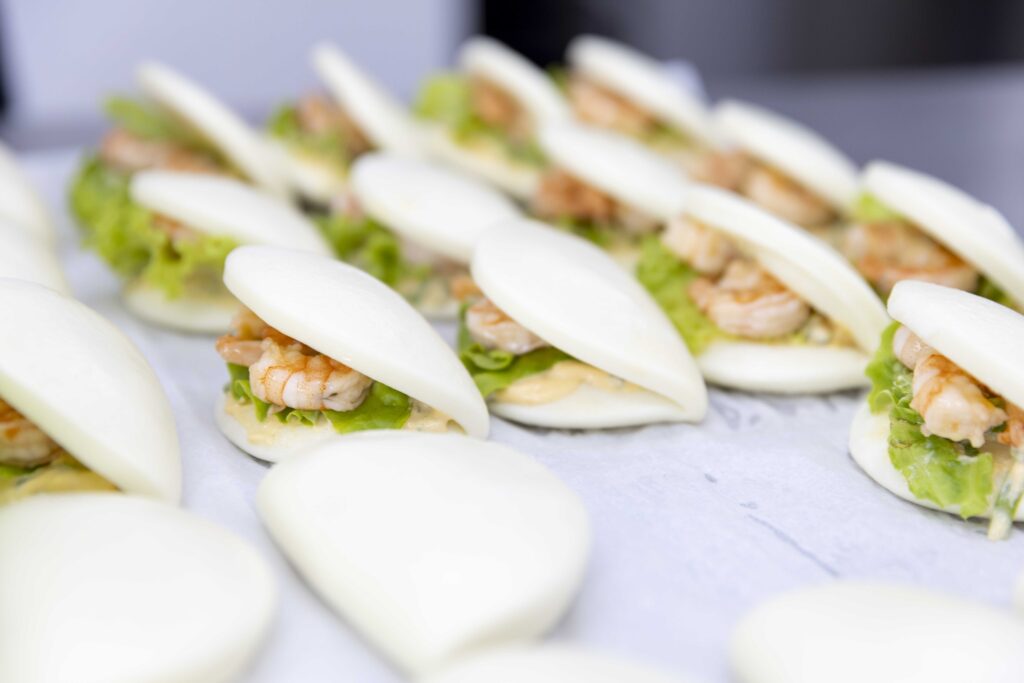 Pain vapeur, crevettes marinées à la sauce chili douce, mayonnaise épicée à l’asiatique, coriandre fraîche et salade verte