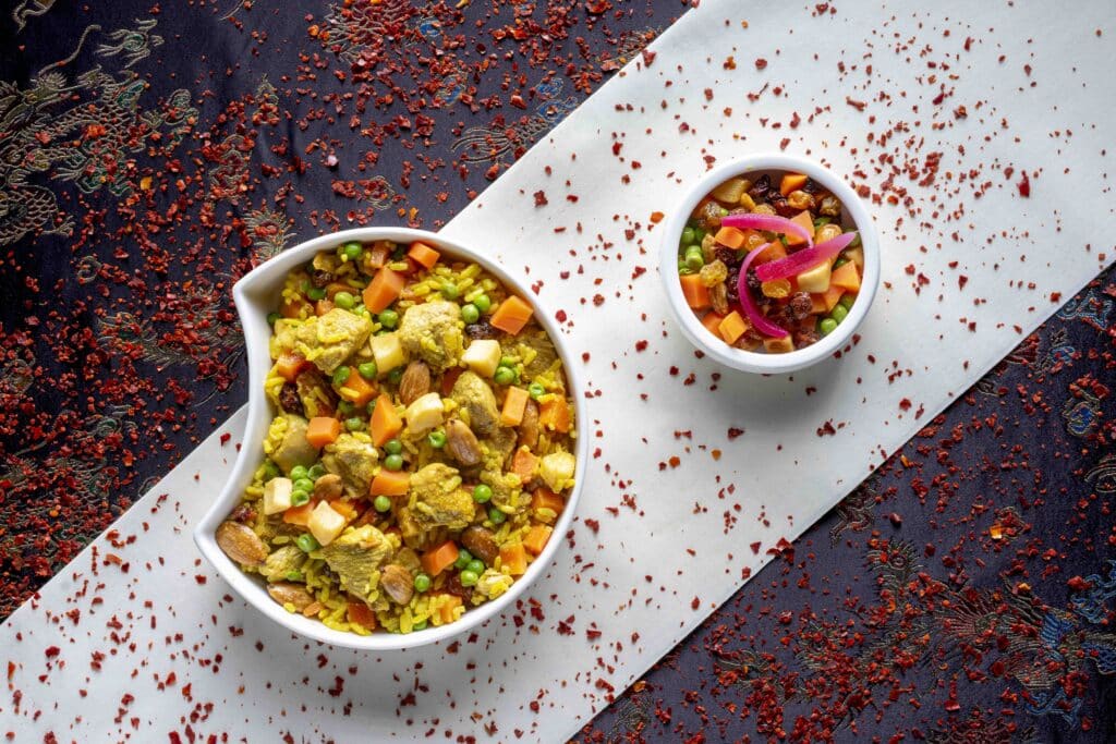 Riz safrané au poulet & fruits de mer, petits légumes de saison